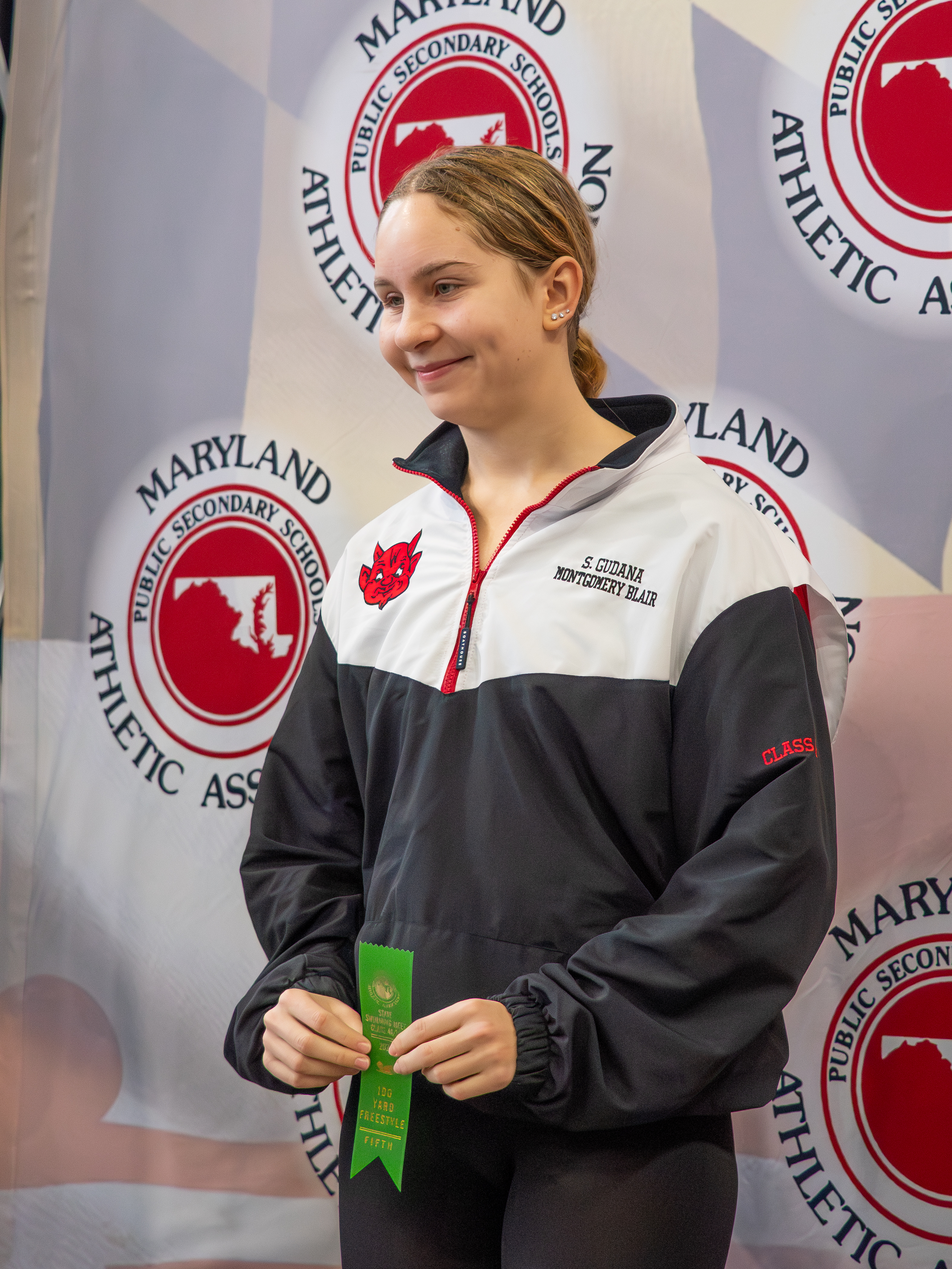 Blair swimmer smiling after winning a ribbon