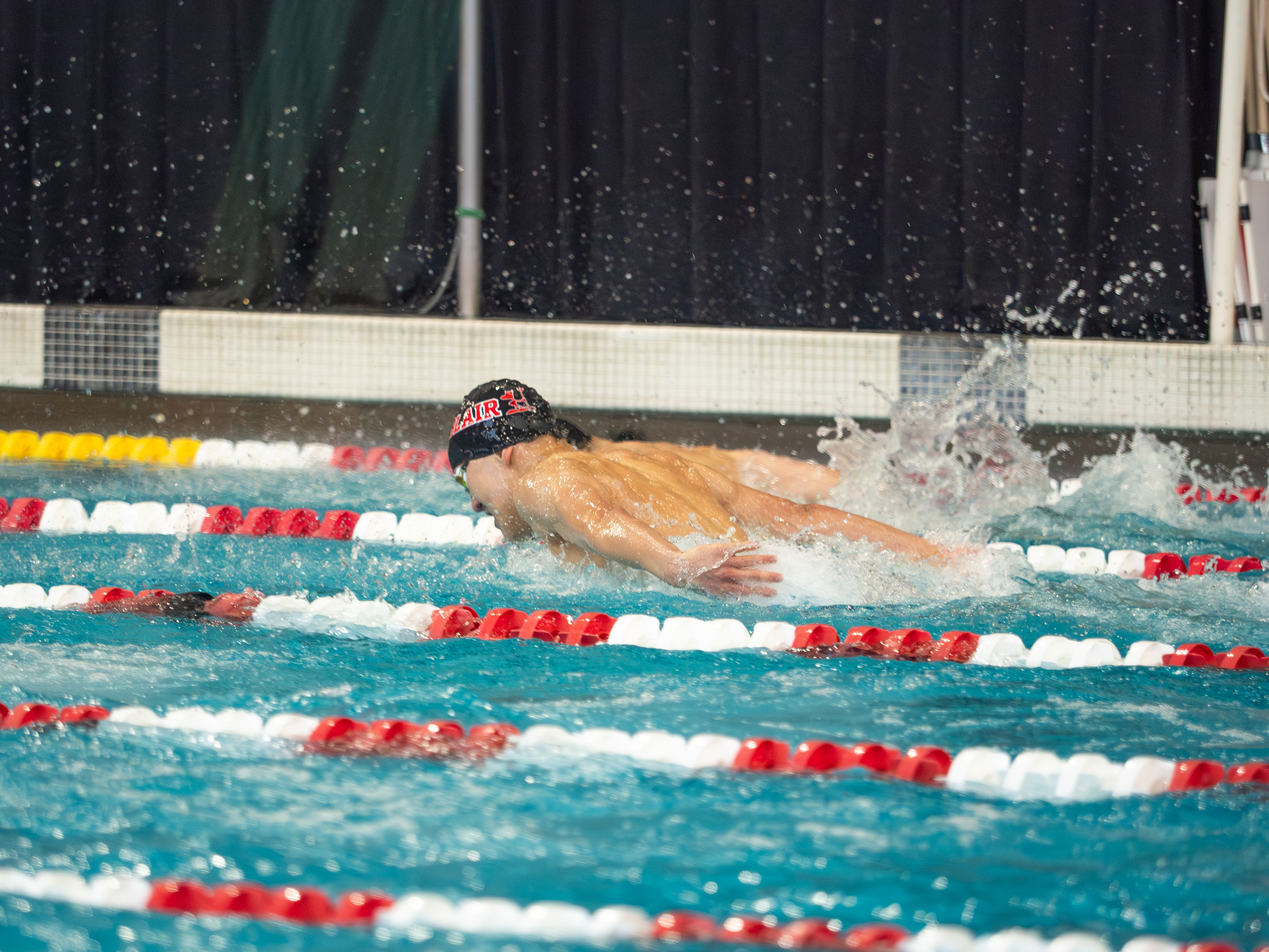 Blair swimmer in the middle of a butterfly stroke event