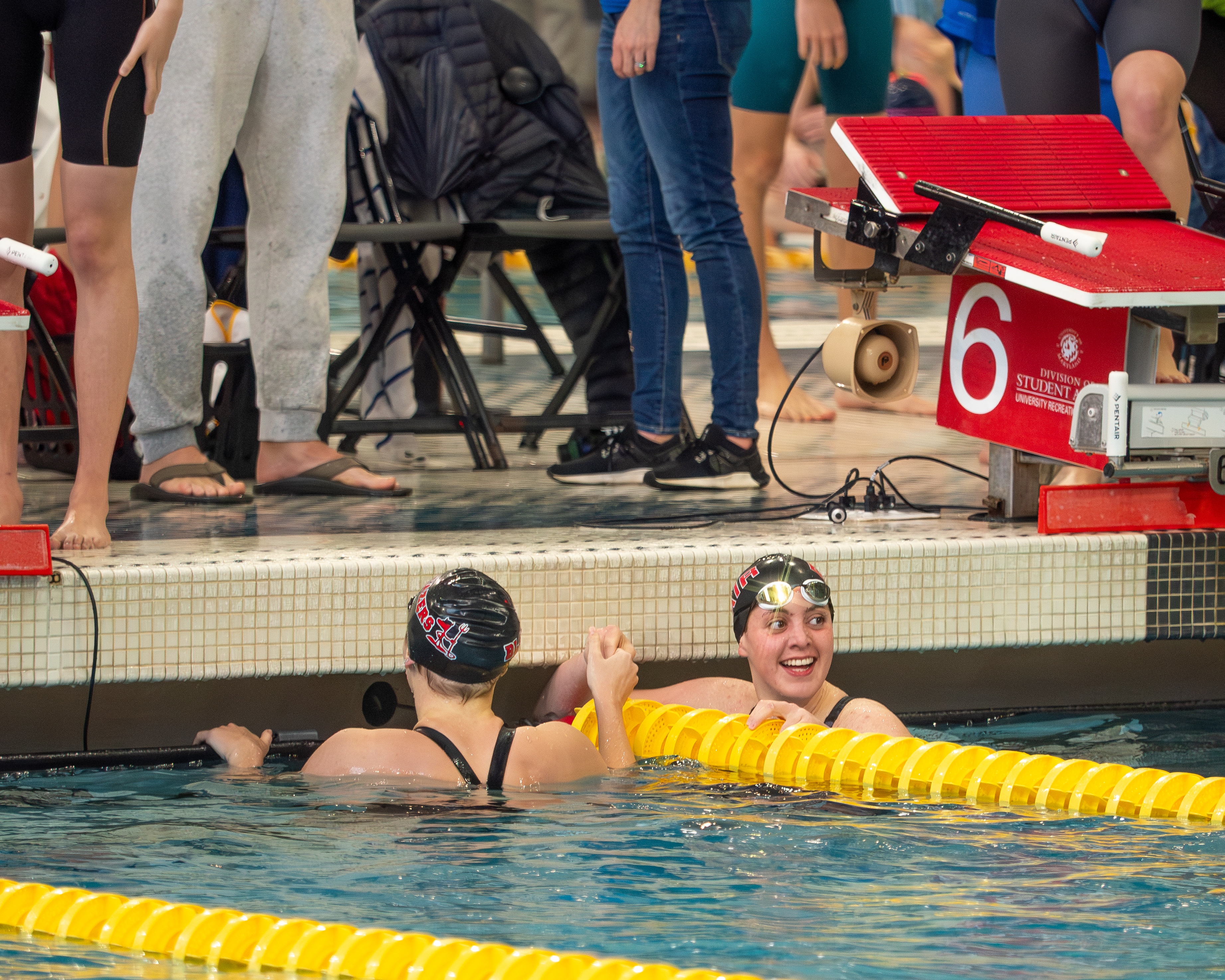 Blair swimmers observing the events while resting for their next race